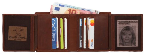 Hergestellt in :IndienProduzent:50-150 MitarbeiterLeder:RindslederLederart:Semianilinleder mit Wachs überzogenGerbung:ChromgerbungFarbe:braunAbmessungen (BxHxT):10 x 10,5 x 1,5 cmInnenfächer:6Fächer gesamt:7Gewicht:0,08 kgInnenfächer:6Kartenfächer:16Marke:Gusti Leder studioReißverschlussfächer:1Verschluss:Druckknopf