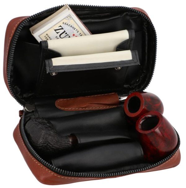 - Platz für max. drei Pfeifen, Tabak, Stopfwerkzeug, Pfeifenreiniger, Streichhölzer usw.