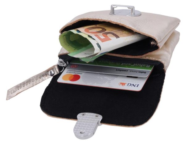 Hergestellt in :IndienProduzent:50-150 MitarbeiterLeder:SchafslederLederart:AnilinlederGerbung:chemischZertifikat:SA8000, ISO & LWGFarbe:Helles GoldAbmessungen (BxHxT):10 x 8 x 3 cmGewicht:0,09 kgInnenfächer:2Reißverschlussfächer:1Verschluss:Reißverschluss + Schnalle