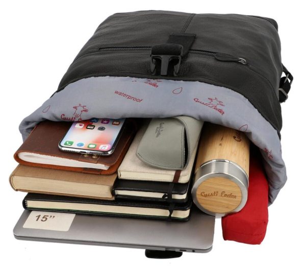 Abmessungen (B x H x T):32 x 50 (63 cm geöffnet) x 12,5 cmHergestellt in :IndienProduzent:150 + MitarbeiterLeder:BüffellederLederart:AnilinlederGerbung:ChromgerbungEigene Gerberei:jaZertifikat:SedexFarbe:schwarzTrageriemen:38,5 – 75 cm